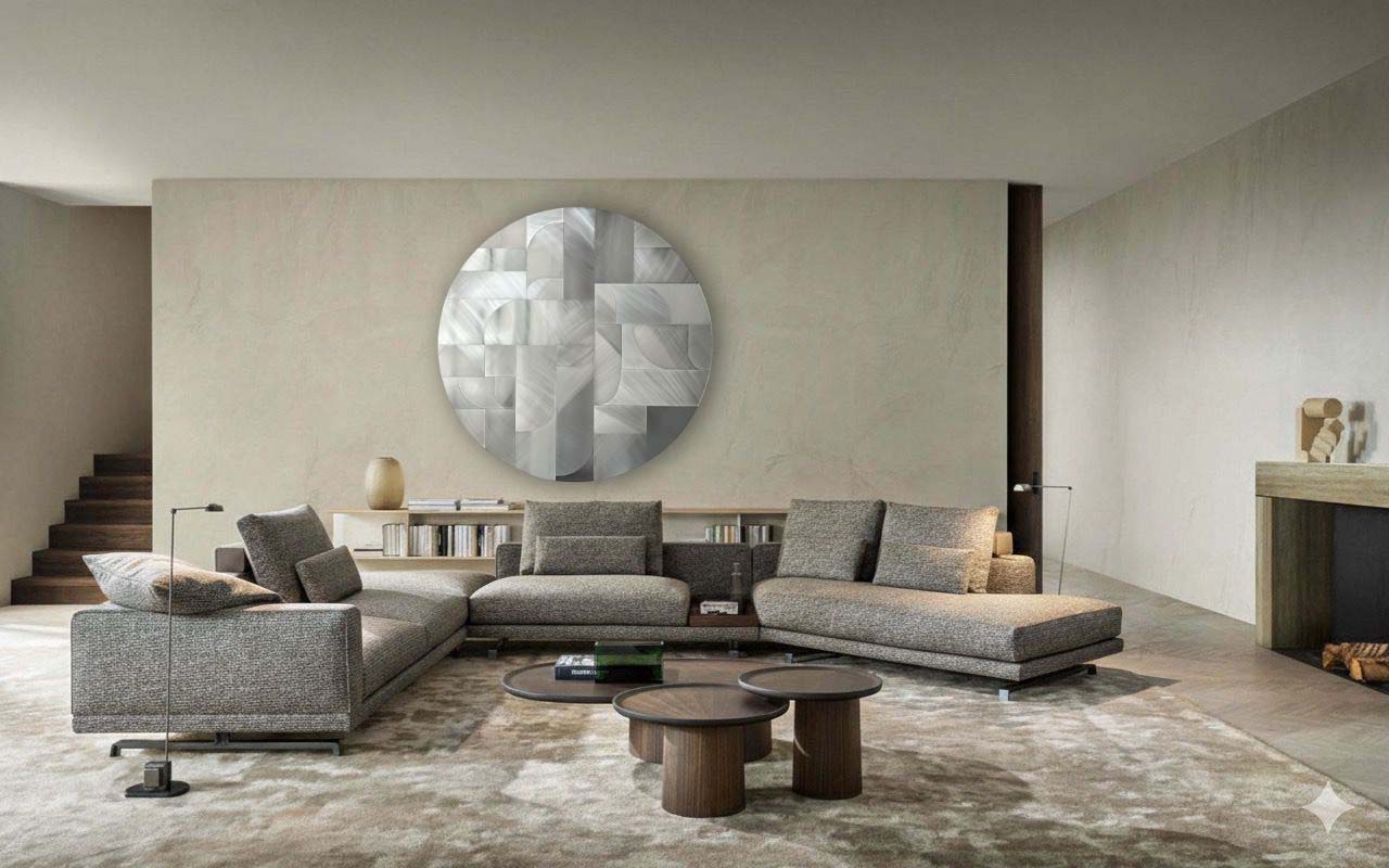 Her geometrik parça, ayın farklı evrelerinden birini yansıtır; kimi ışığın tam hâlini, kimi gölgenin derin sessizliğini taşır.